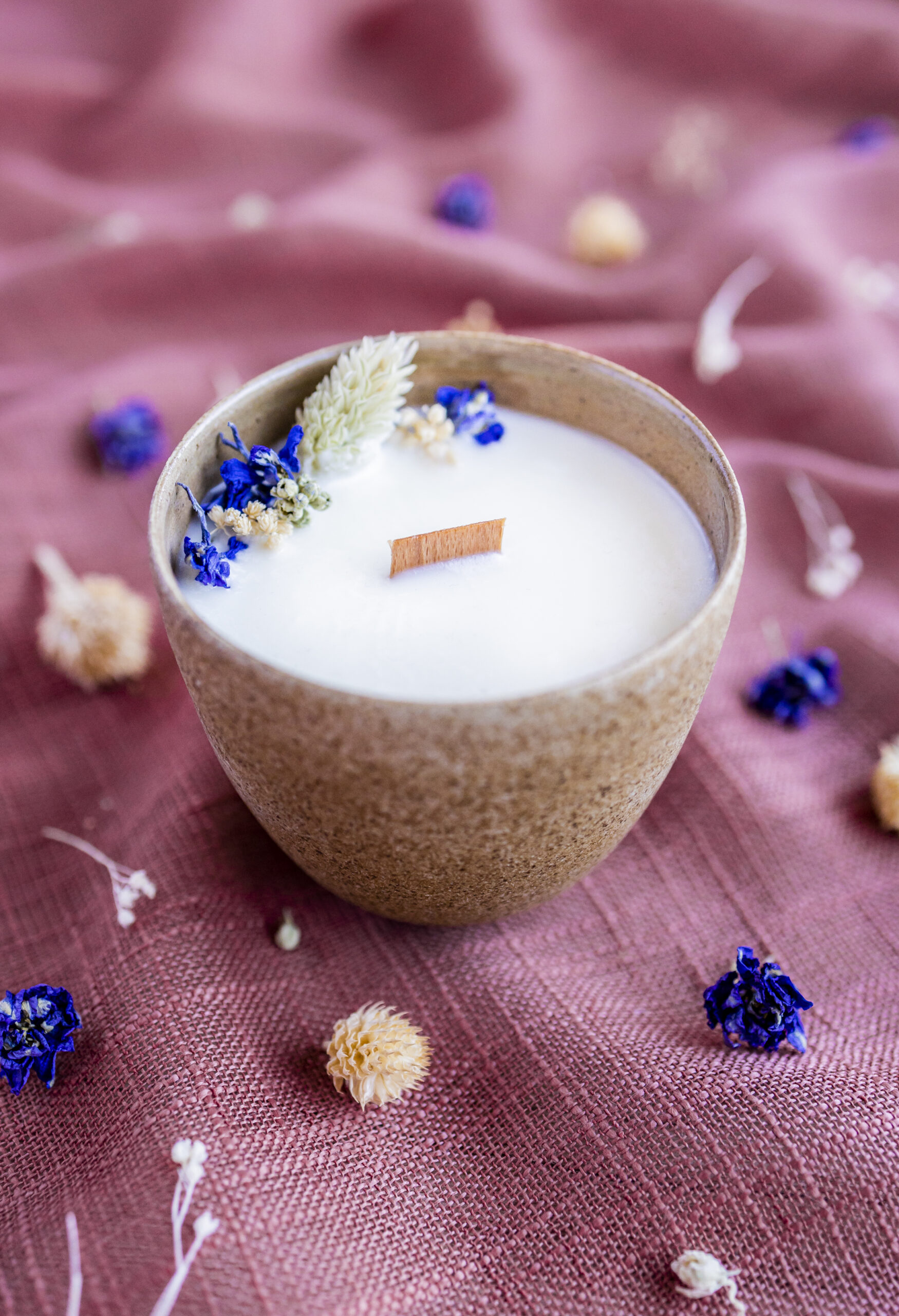 Notre bougie est façonnée et coulée à la main, nos contenants peuvent avoir des légères variations de couleur et forme. La cire peut également présenter des traces de marbrures, légères fissures, ou petites bulles cela n’altère en rien la qualité de la bougie. La décoration florale peut également varier suivant les fleurs disponibles dans nos ateliers.