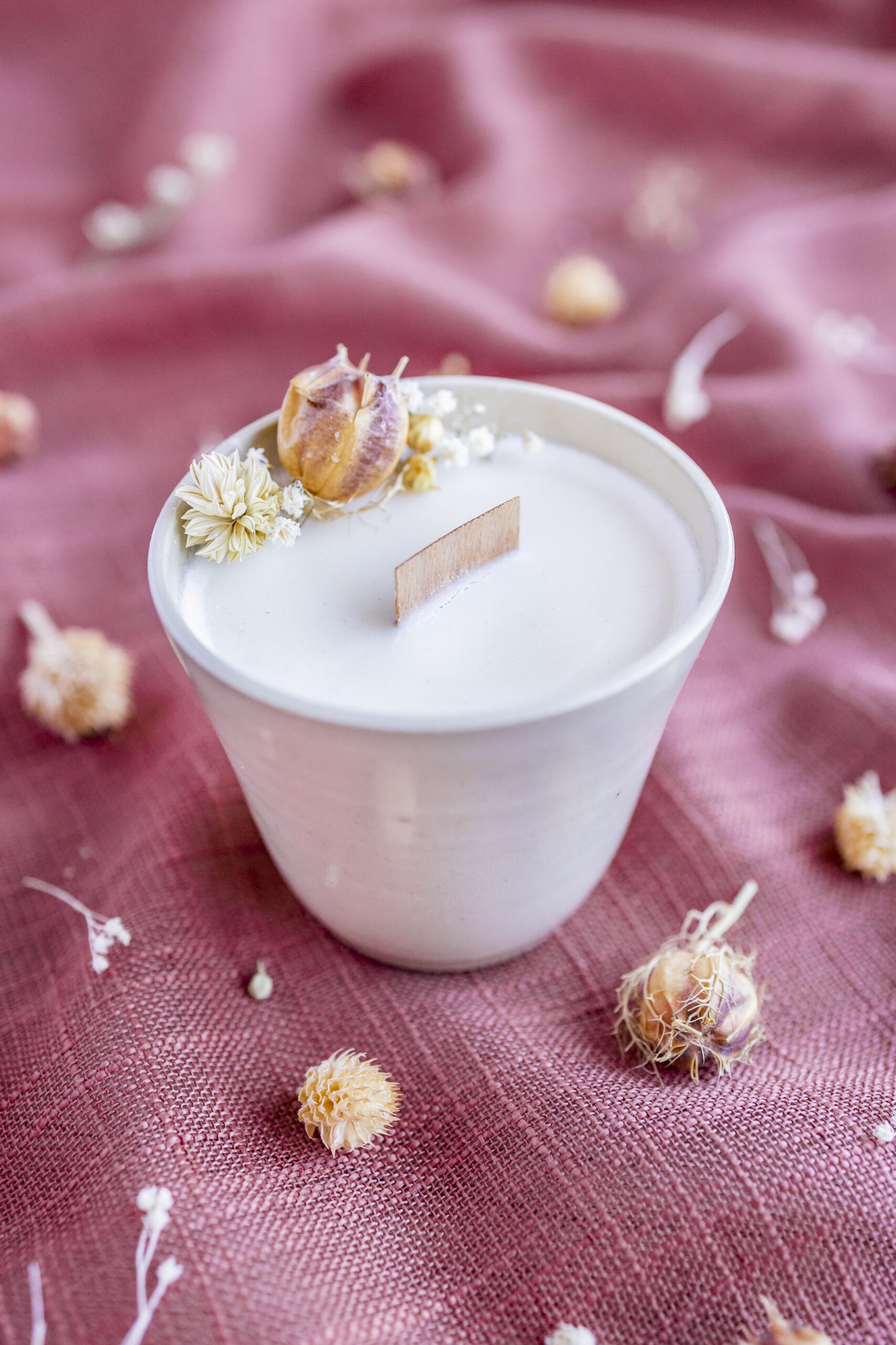 Notre bougie est façonnée et coulée à la main, nos contenants peuvent avoir des légères variations de couleur et forme. La cire peut également présenter des traces de marbrures, légères fissures, ou petites bulles cela n’altère en rien la qualité de la bougie. La décoration florale peut également varier suivant les fleurs disponibles dans nos ateliers.