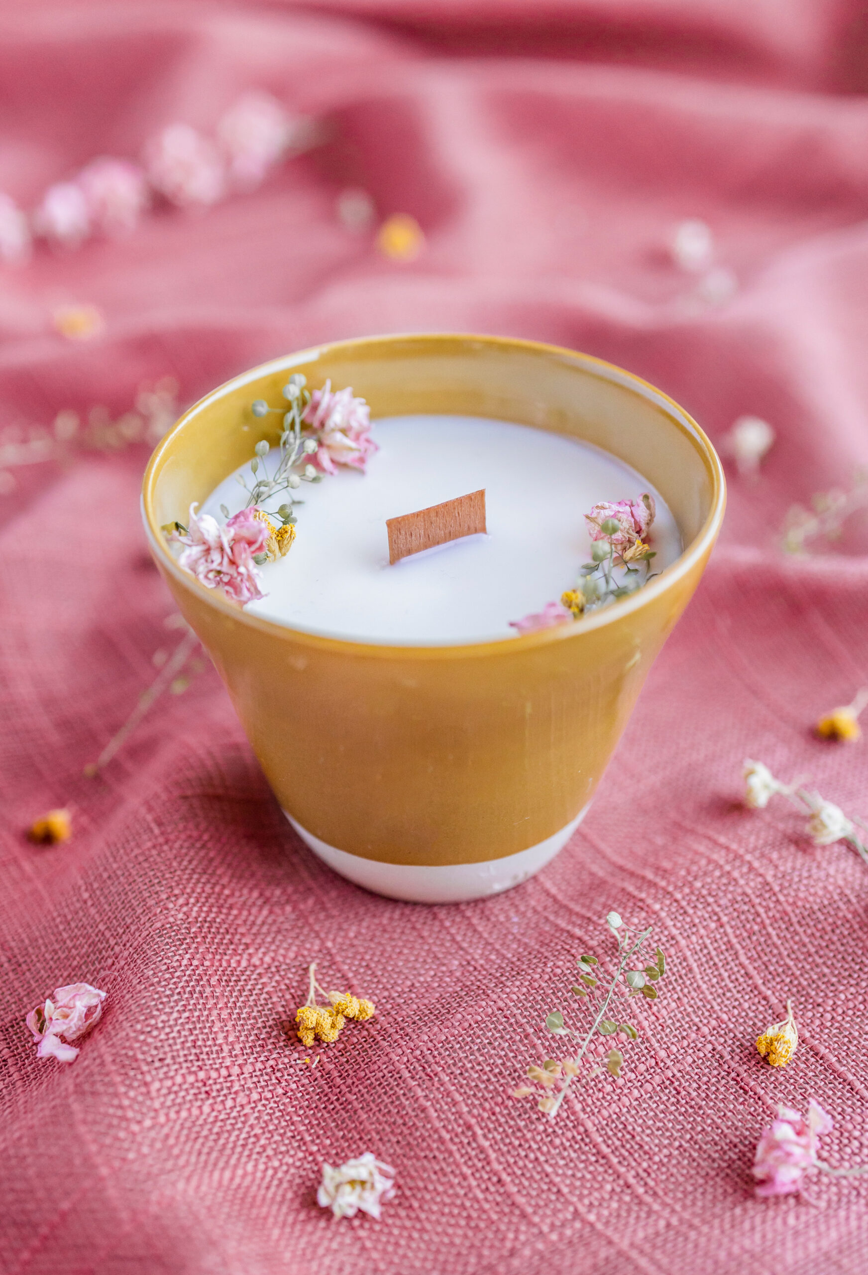 Notre bougie est façonnée et coulée à la main, nos contenants peuvent avoir des légères variations de couleur et forme. La cire peut également présenter des traces de marbrures, légères fissures, ou petites bulles cela n’altère en rien la qualité de la bougie. La décoration florale peut également varier suivant les fleurs disponibles dans nos ateliers.