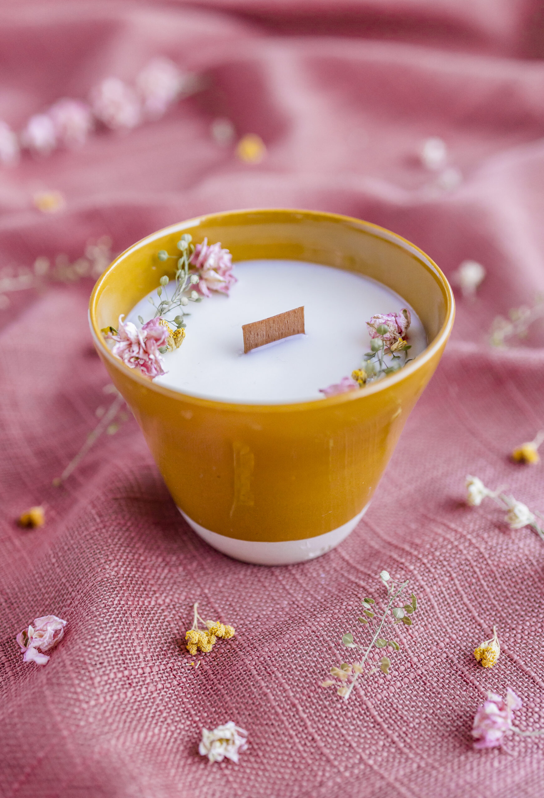 Notre bougie est façonnée et coulée à la main, nos contenants peuvent avoir des légères variations de couleur et forme. La cire peut également présenter des traces de marbrures, légères fissures, ou petites bulles cela n’altère en rien la qualité de la bougie. La décoration florale peut également varier suivant les fleurs disponibles dans nos ateliers.